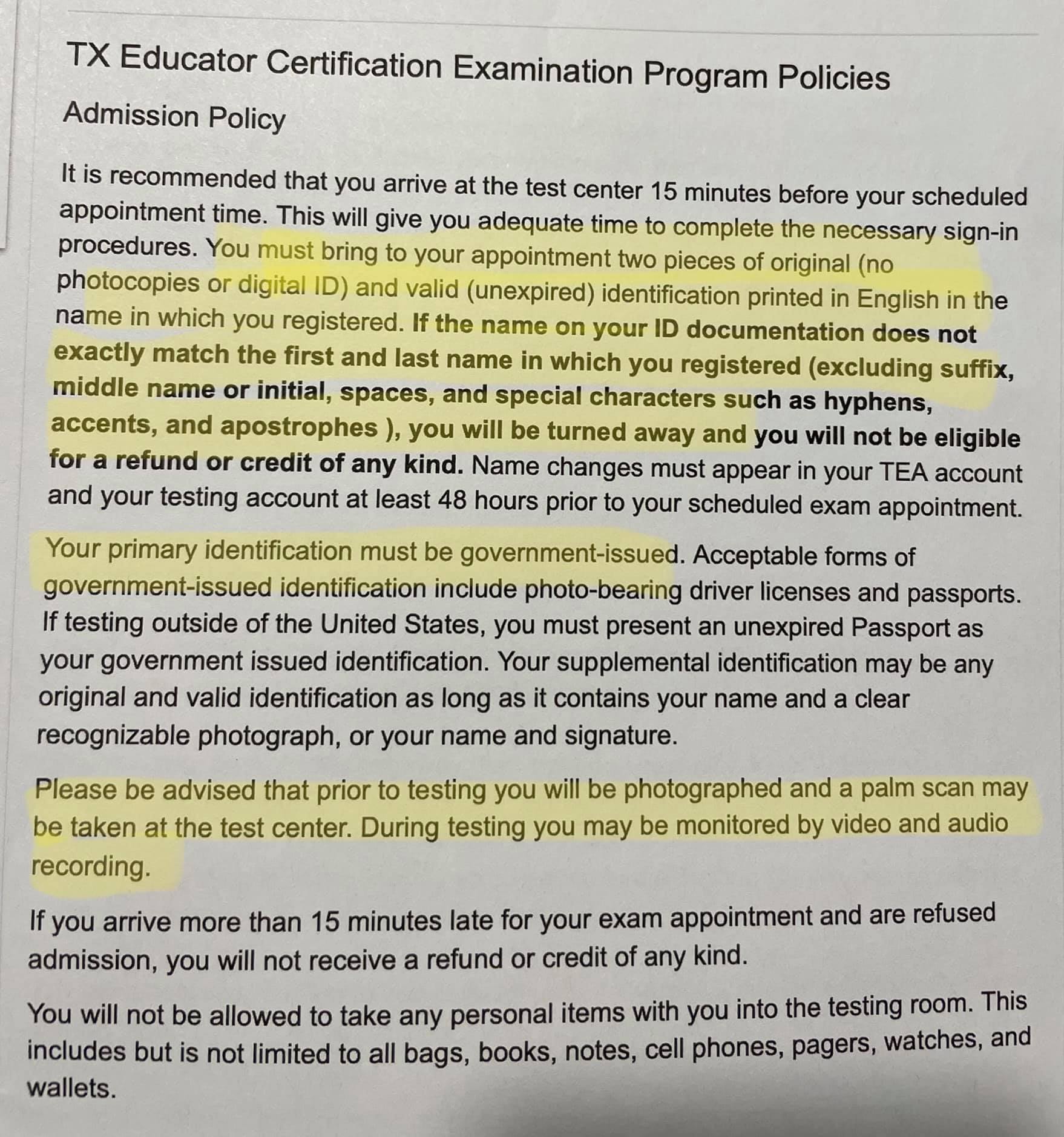 Who would have thought that preparing to take a test for my ESL certification would prompt a blog post. The following is from the e-mail I received about the security measures they have in place at the testing center: